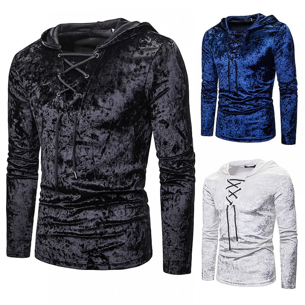 New Men's Diamond Velvet European Size Loose Shoelace Hooded Long Sleeve T-Shirt