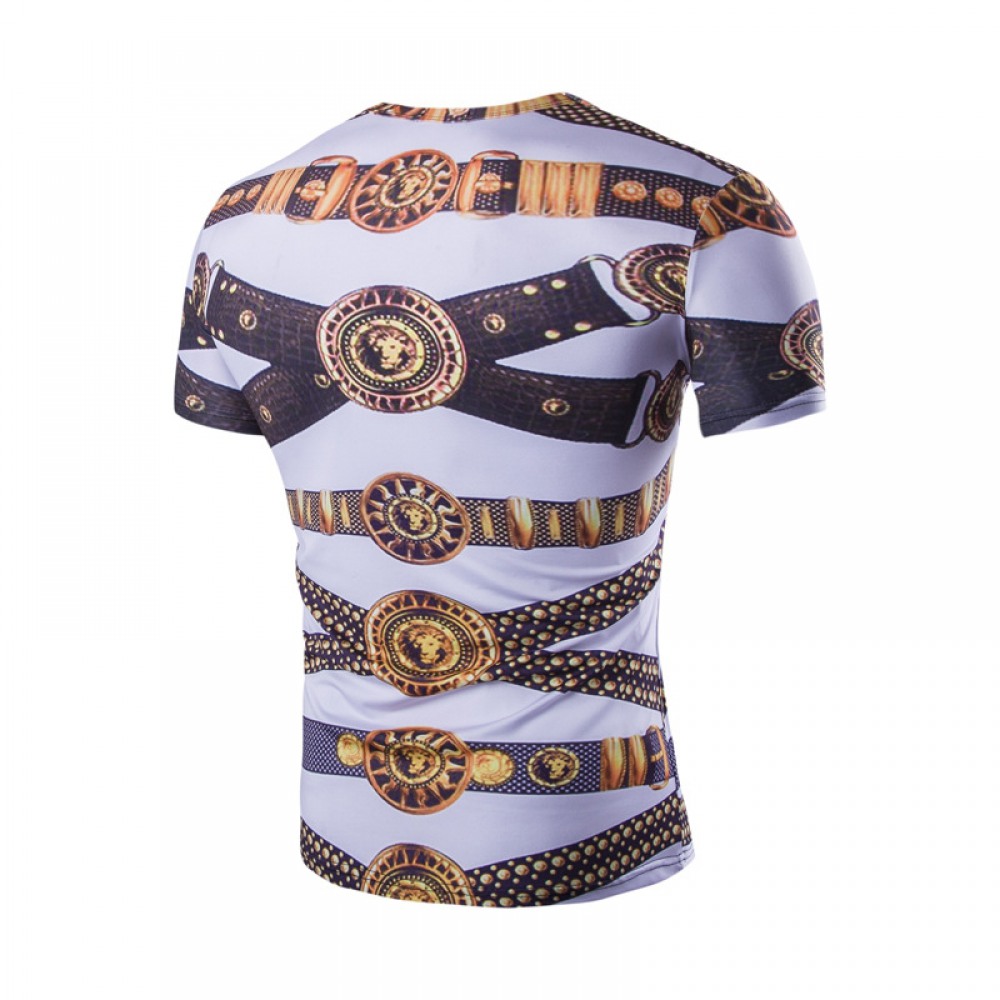 Summer Men's Gold Belt Striped Pattern Casual Round Neck Short-Sleeved T-Shirt